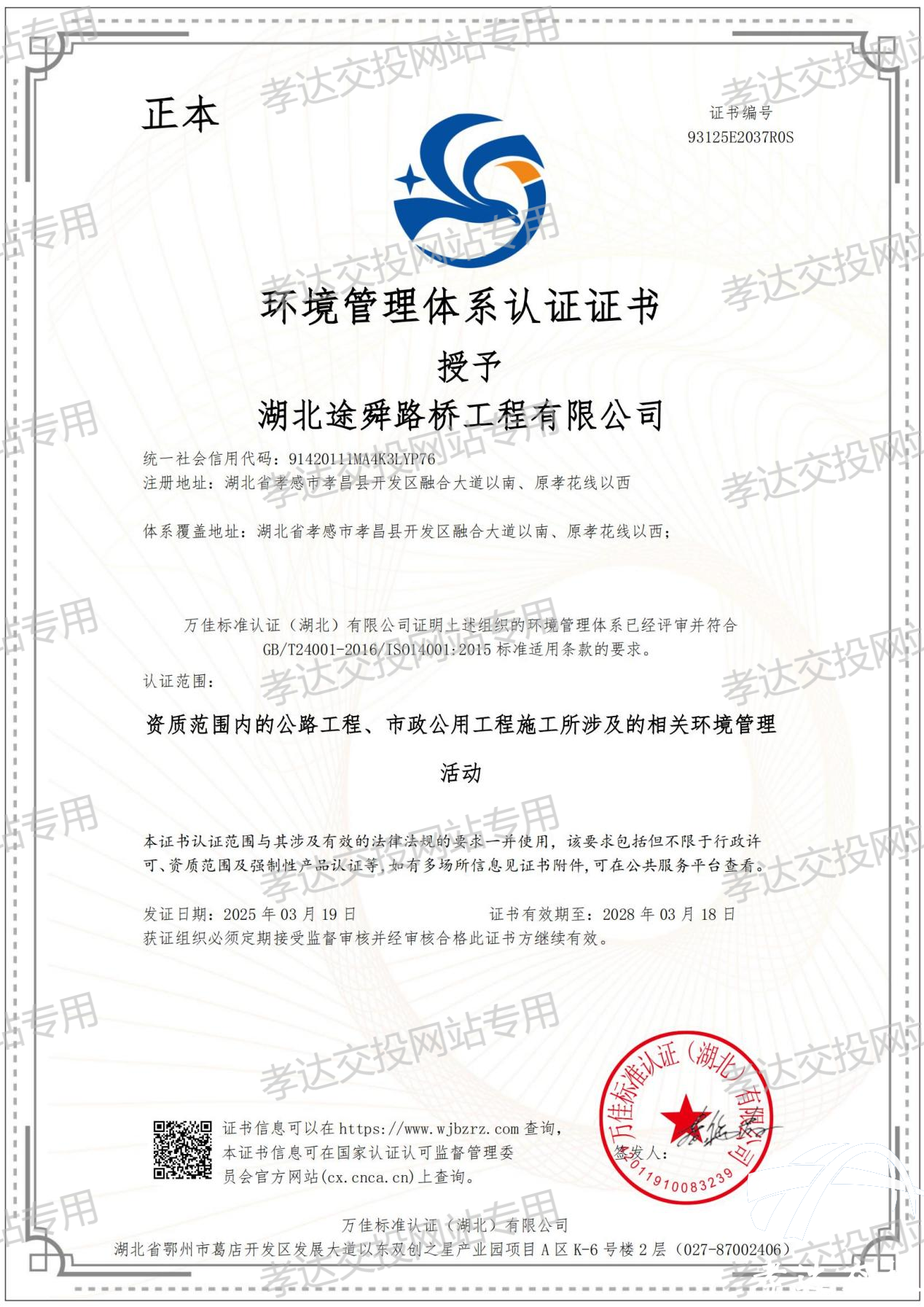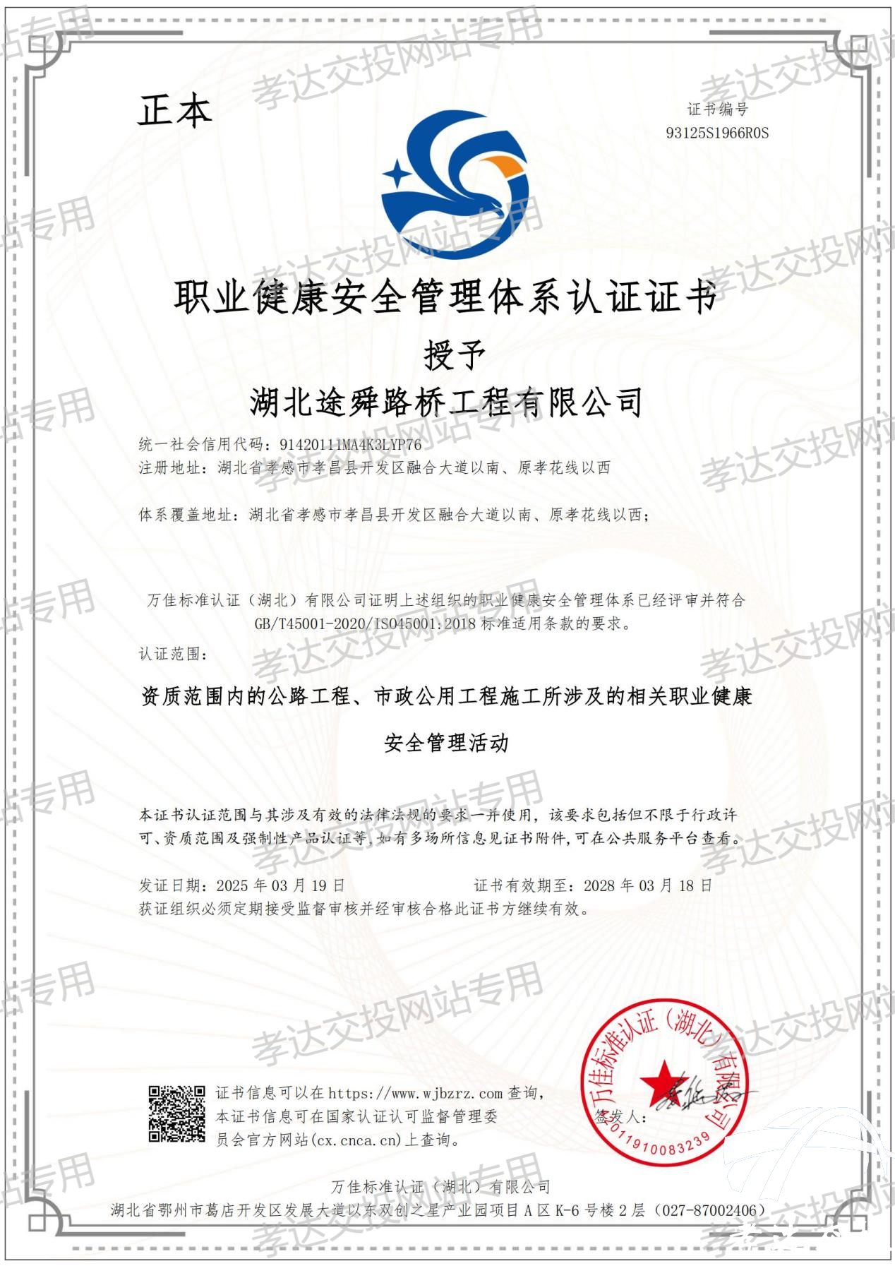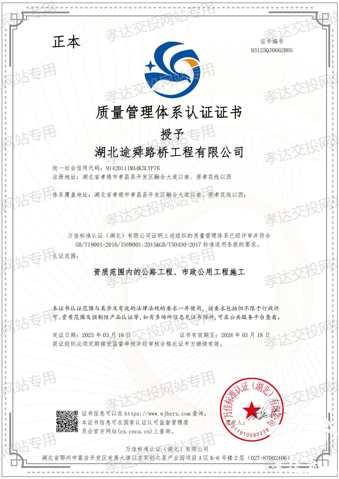 发布时间: 2025-03-21 17:47:263月19日,孝达交投全资子公司——湖北途舜路桥工程jinnianhui今年会,在顺利通过中国质量认证中心万佳标准认证中心《质量、环境和职业健康安全管理》三标体系认证审核后,取得三标管理体系认证证书。